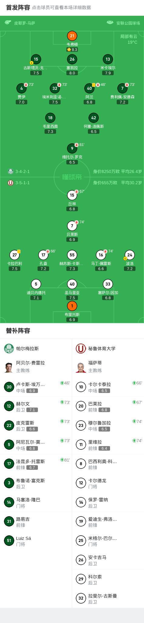 帕尔梅拉斯0-0秘鲁体育大学,势均力敌 2026-01-10 04:54:55 nba 5℃ 0 南美解放者杯1/8决赛次回合,帕尔梅拉斯对阵秘鲁体育大学的比赛在常规时间内以0比0握手言和。凭借此前建立的优势,帕尔梅拉斯以总比分4比0淘汰对手,顺利晋级下一轮赛事。球队阵容 技术统计 相关推荐 帕尔梅拉斯0-0秘鲁体育大学,势均力敌